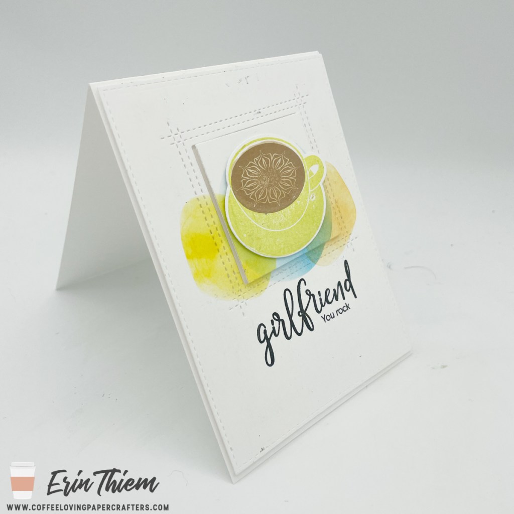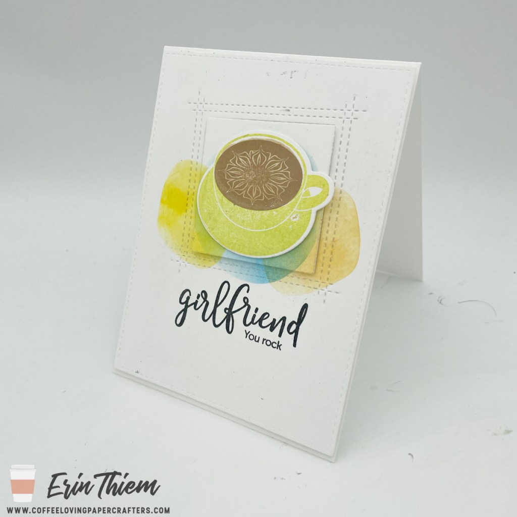 Hello, Erin, here for another Creative Chaos Saturday fun. I say this often, but I love white on white with a pop of color, so why not celebrate friendship with a coffee card! I used a Simon Says sentiment set, Lil Inker Designs retired coffee cup, Taylored Expressions stencils and a MFT die for today’s card.