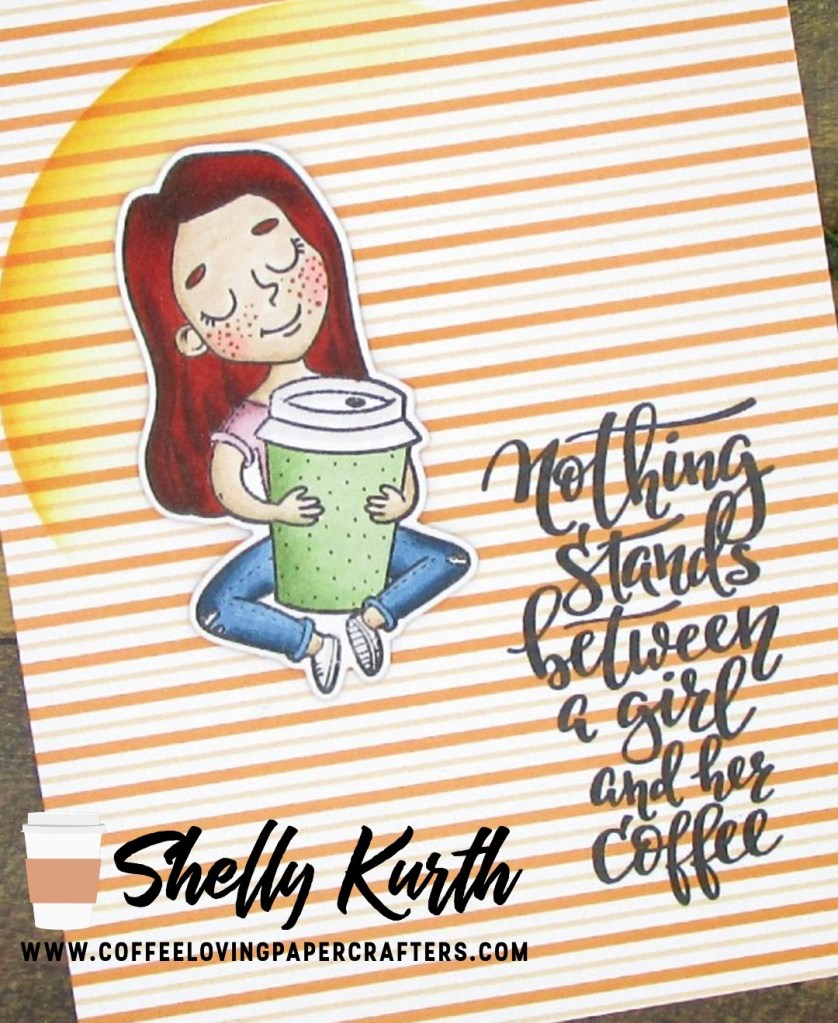 I kept things nice and simple. I started with stamping and coloring the girl with Copic markers. I even gave her little freckles. 😉 I then did some partial stenciling with a circle stencil onto patterned paper using an orange color ink. Lastly, I stamped on the sentiment and then added the die cut girl. Easy peasy, right?!…