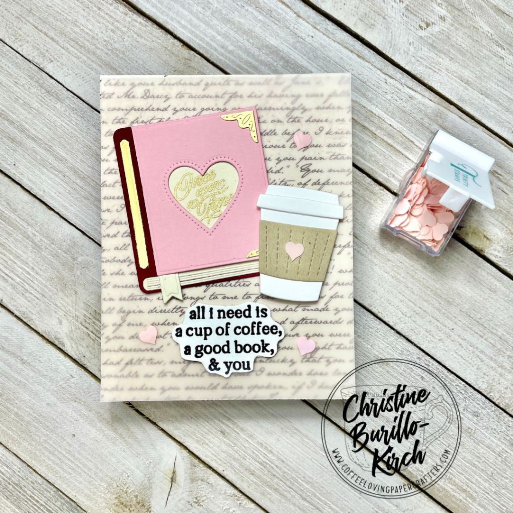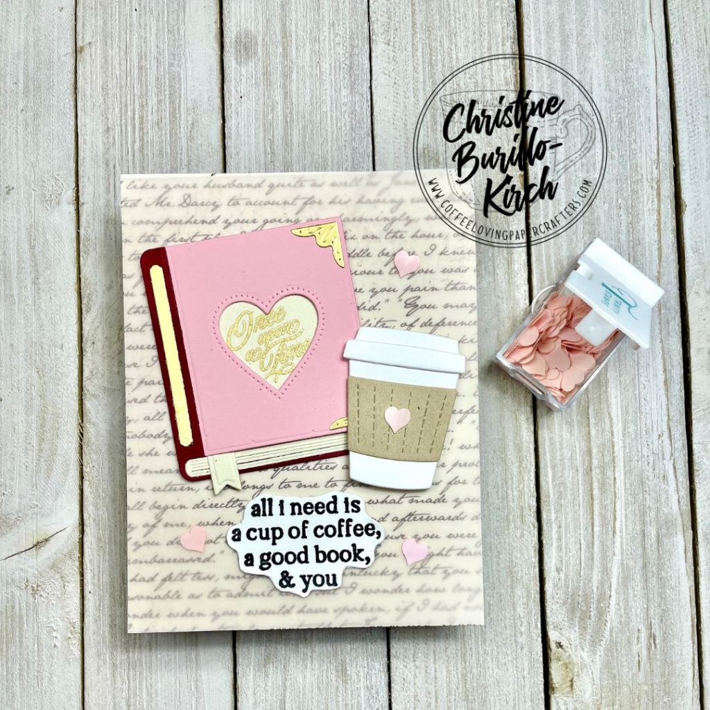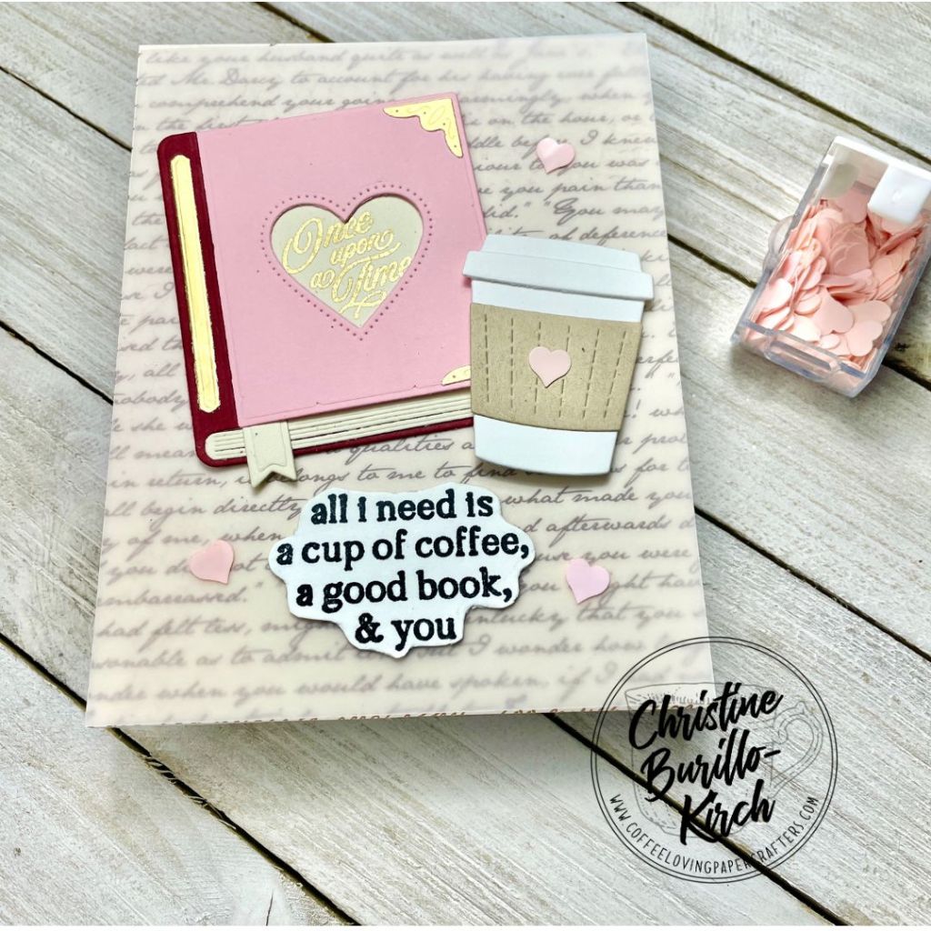 Hi there, Christine here with a Coffee and Book card using products from Super Sponsors The Greetery, Concord & 9th and Waffle Flower.