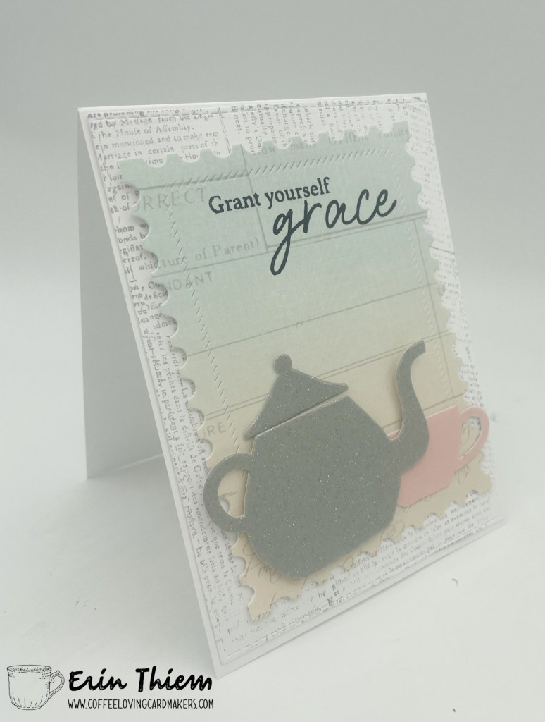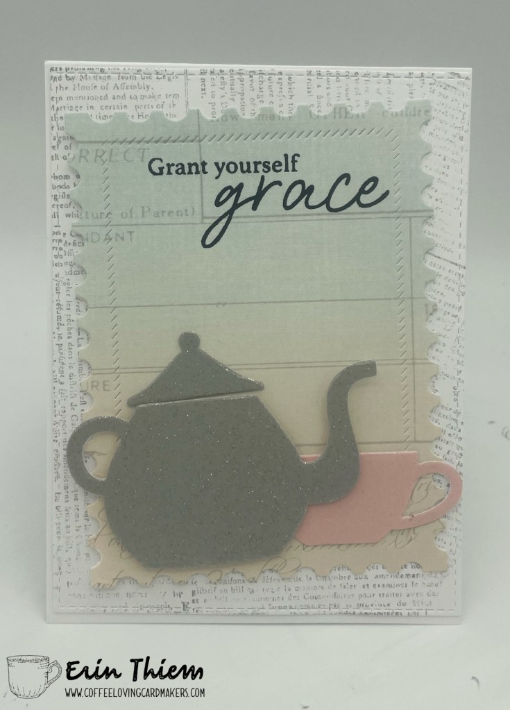 Hello, Erin here with another Creative Chaos. My first card channels my love of white on white, coffee & cookies! I’ve combined MFT coffee die, Hero Arts and Stampin Up sentiments and a cookie by Stampin Up. My second card is for my friend overseas who loves tea…. my word of the year is grace, so I keep seeking it out in the universe, so sending this to her as a thinking of you.