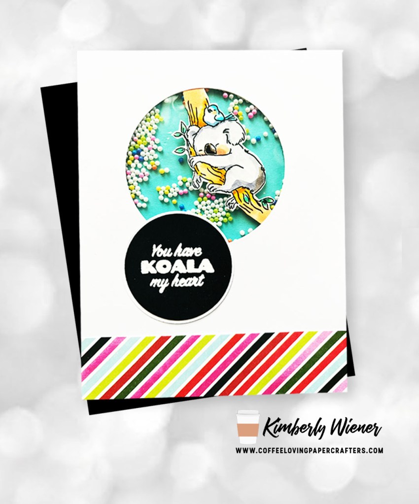 You Have Koala My Heart: I selected the sweet image of the Koala sleeping in the tree with a sweet birdie pal and made a shaker card. I die cut a circle slightly off center in white cardstock and chose some lovely turquoise cardstock as the second layer.