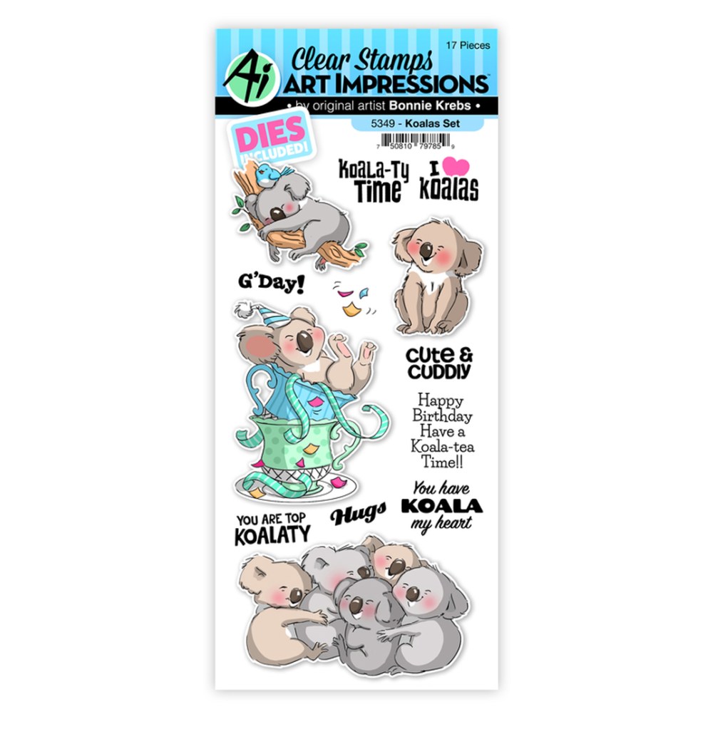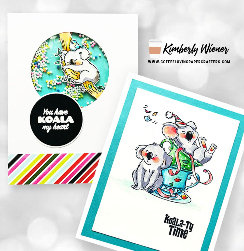 Both cards are featuring the Koalas Set. This stamp set has four koala images, a mini confetti image, and eight sentiments. It’s great that this set comes with the dies included.