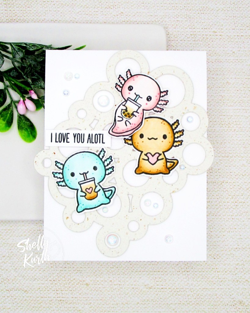 I did keep things simple, just some coloring with alcohol markers and then a little fussy cutting. After, a fun ‘bubble’ background and a little sentiment. I added things to my card base and then topped everything off with a touch of pearls. Sweet, right?!…