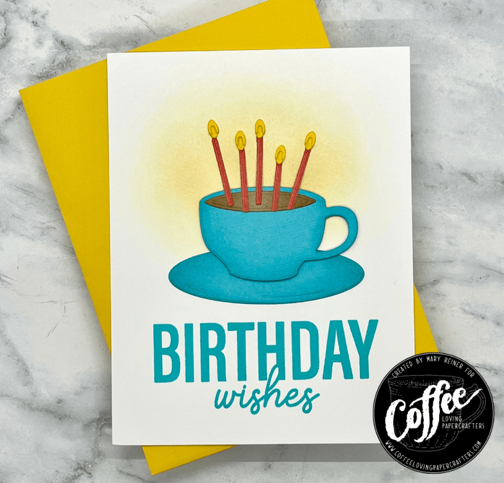 To create this card, I started by adding a little bit of Honey ink to a white A2 panel. Next, I die cut all of the pieces out of colored card stock, inked the edges a bit, and assembled them. I decided upon the placement of the cup and then determined where to stamp the sentiment. I stamped the sentiment in Surf ink and adhered the cup to the base. Foam squares were added to the cup for dimension. Yellow Wink of Stella was added to the flames for sparkle. This birthday card came together easily.