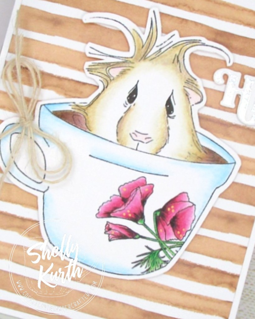 I used an Impression Obsession stamp that my friend Von Marie sent me (Thank you, Von Marie!). Isn’t that image so cute?!…I did keep things simple with a little coloring, which I actually pulled out my colored pencils for! Yay! It’s been a while since I’ve used those! lol I did some fussy cutting with the image after and then added a touch of gold to the flowers using a gold gel pen. I then used some patterned paper from Not 2 Shabby. Added things to my cardbase and then topped things off with a foiled ‘hi’ sentiment and some burlap twine. Easy peasy, right?!…