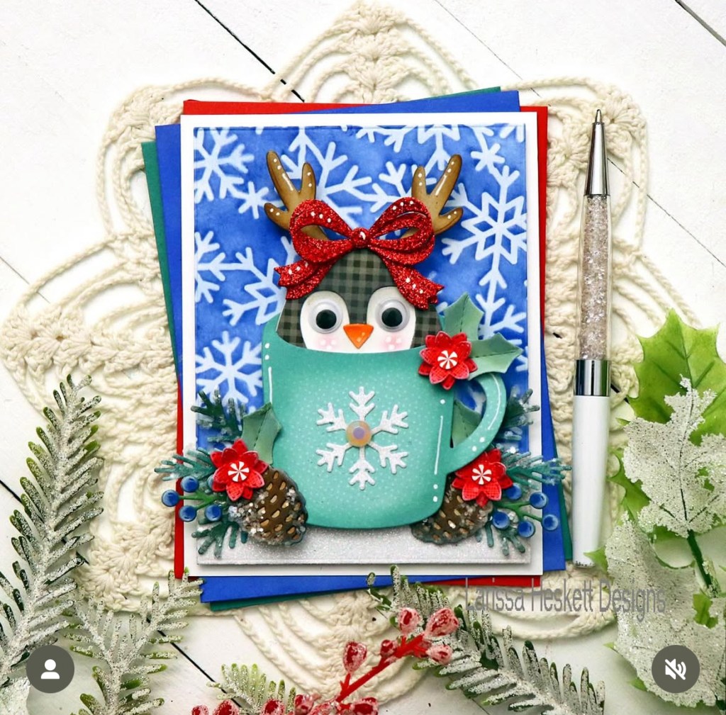 How absolutely darling is this penguin reindeer peeking out of the mug! Love all the festive details Larissa added and the colors are so merry & bright!