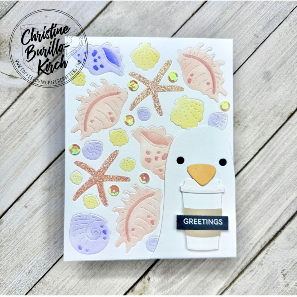 My final favorite card uses products from Super Sponsor Waffle Flower. I love the Inquisitive Seagull die series and paired it with the Seashell Texture background die in the card shown below.