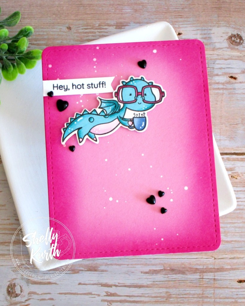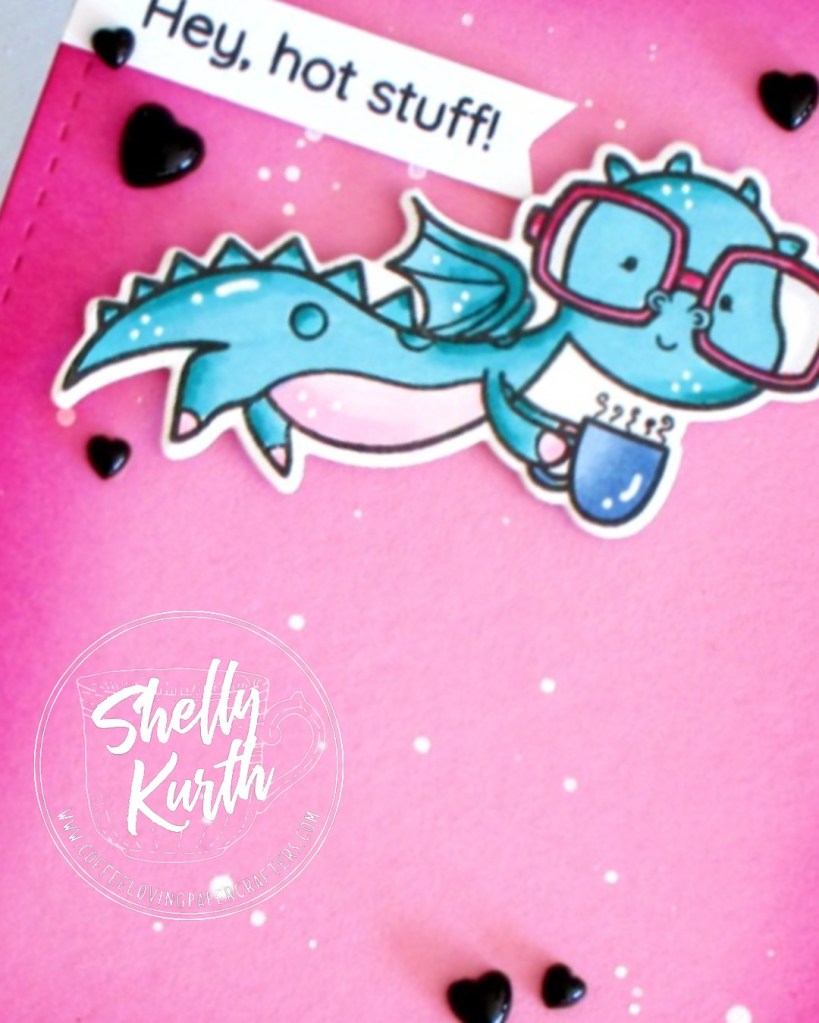Cute, right?!…I just love that little dragon with the glasses and coffee cup! I kept things simple. I just did some coloring with alcohol markers and then a little blending with ink for some depth on the pink cardbase. After, some white paint splatters and black heart enamel embellishments. Nice and easy. right?!…