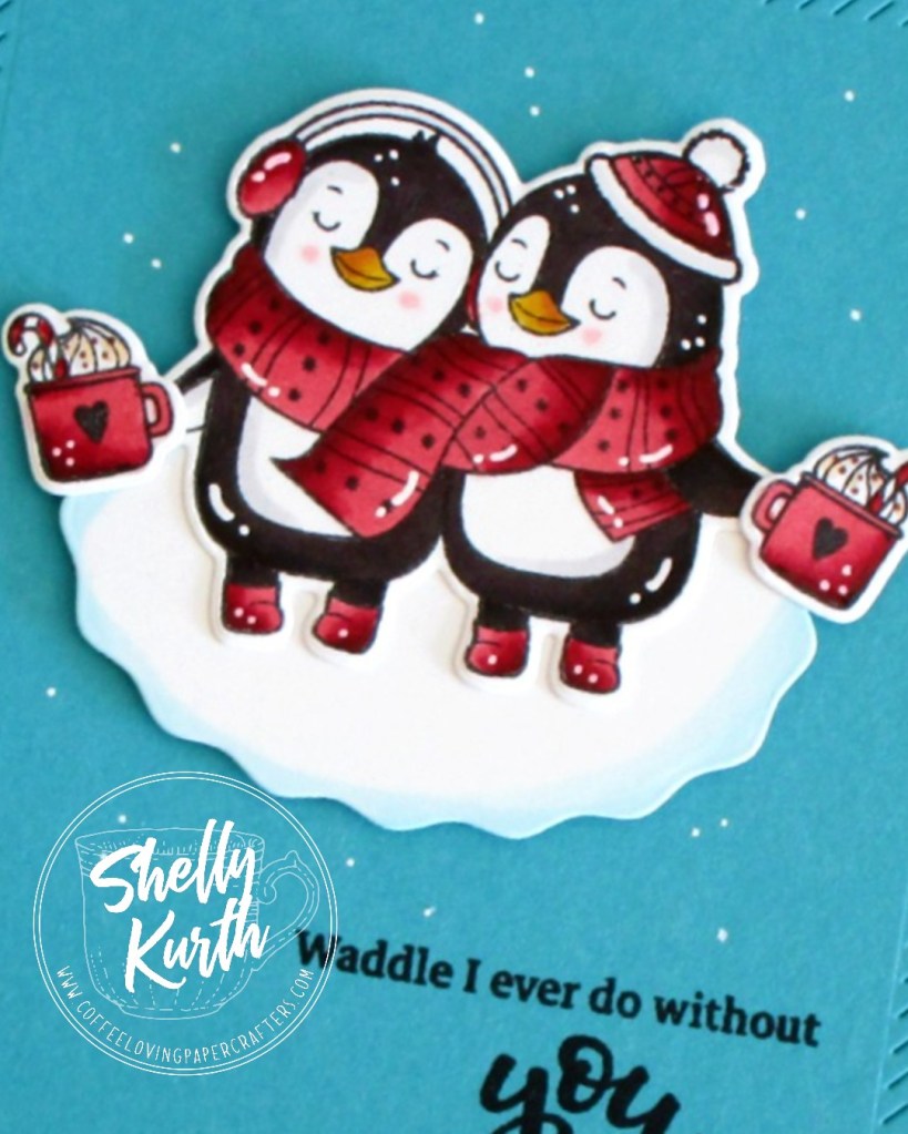 I had so much fun with this card! I didn’t really know where things were gonna go but it seems it all worked out in the end! I started with just coloring up the images and then used the matching die with them. After, I used an older die (and when I say old, I mean, Lil Inker Designs old…anyone else remember them?!) for the border on the cardbase and then added some white paint splatters. To finish things off, another die from my stash that I thought could be used as ‘ice’ to have the penguins on. Fun, right?!…
