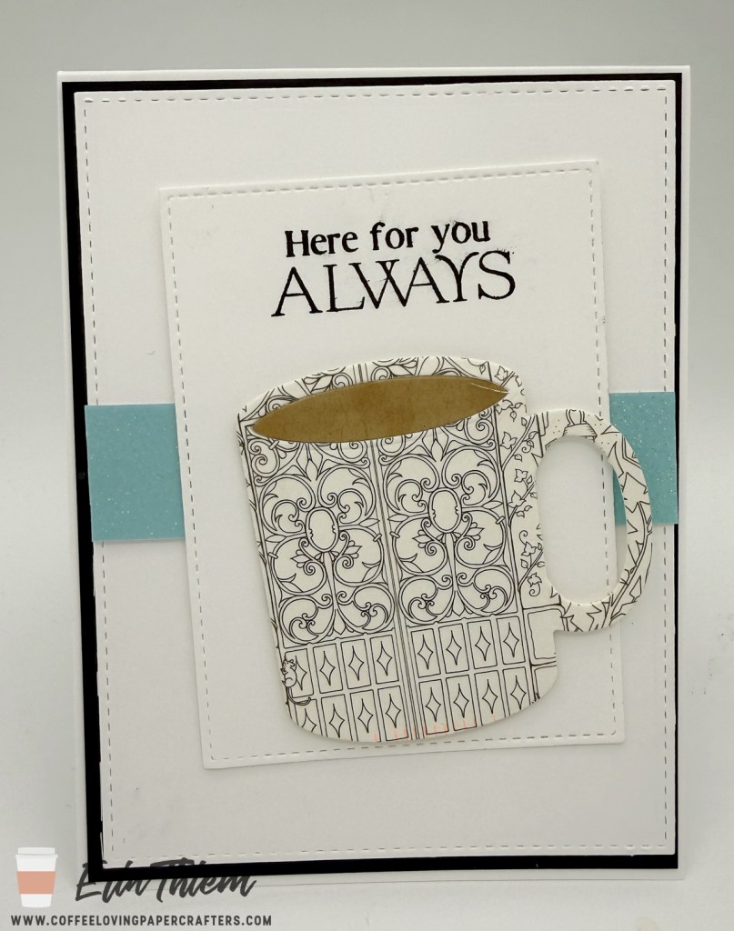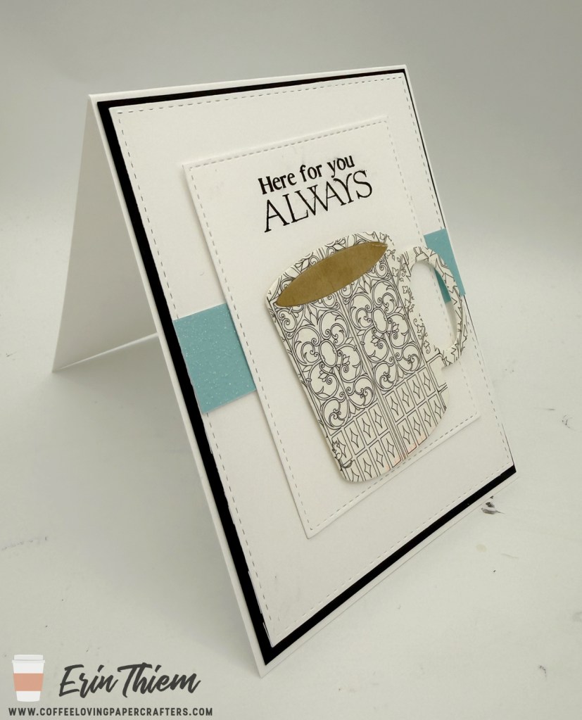 Hello, Erin here for a Creative Chaos, with my favorite white on white trend. Today’s card was inspired by this week’s Freshly Made Sketches, it’s good for me to see an oval and turn it into a rectangle (my literal brain needs to be stretched). My card uses a Pink Fresh Studio sentiment, Lil Inker Designs coffee mug with an upcycled postcard I got from a friend and MFT dies.
