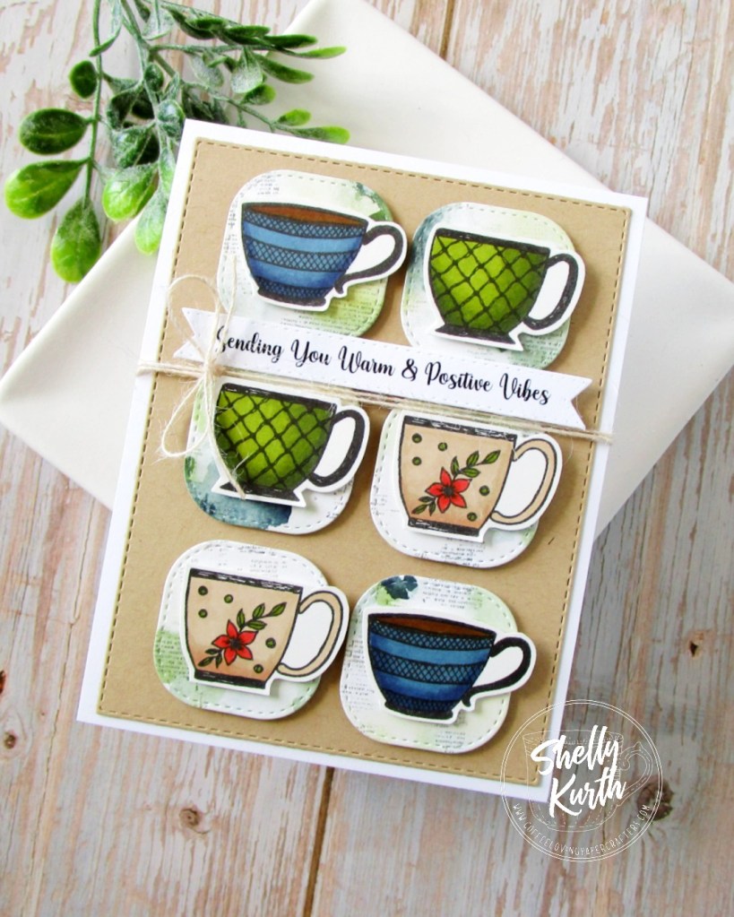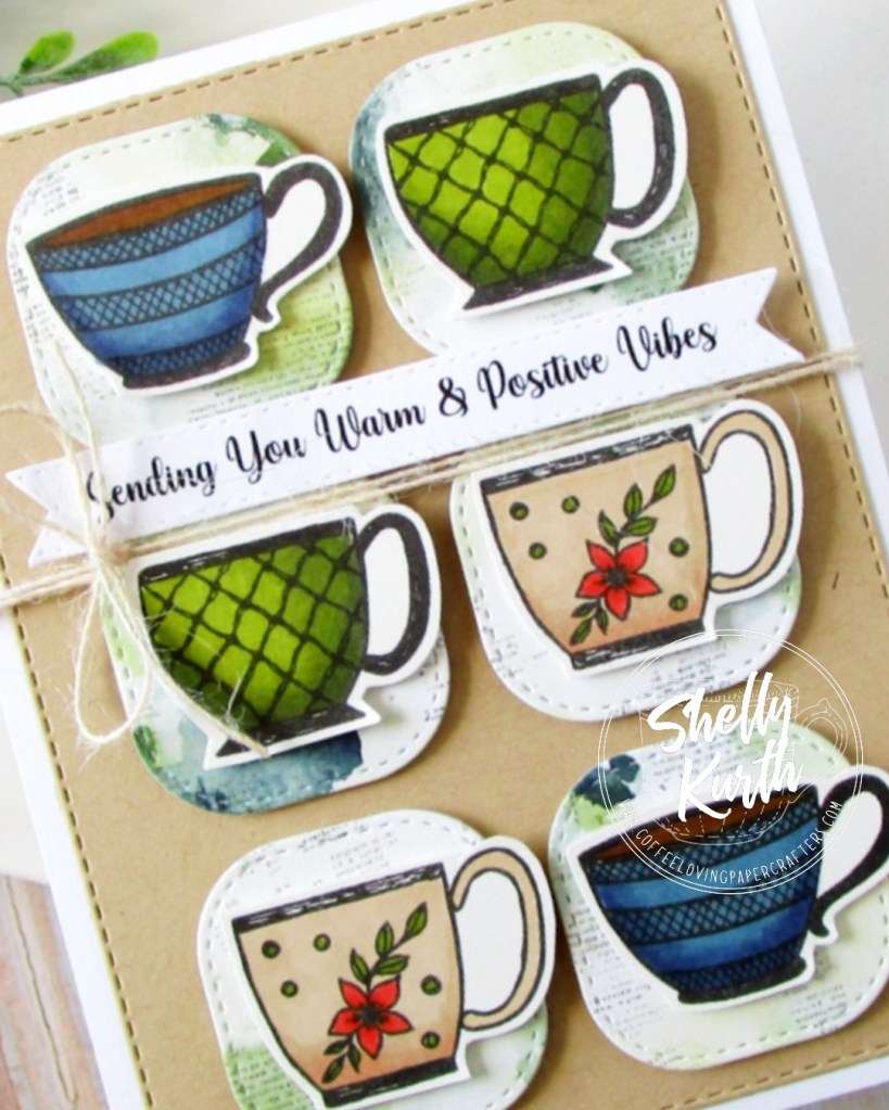 For my card today I used a mix of goodies. From Not 2 Shabby (patterned paper, sentiment/banner) to Brass & Bliss Craft Co. (rounded stitched squares/stitched panel) to Journals for Life (cups). I really just used what I had on my desk in my never ending ‘new to me’ stash/save for later bin. Surely we all have this type of bin or pile, right?!…It’s not just me, hopefully. (lol)