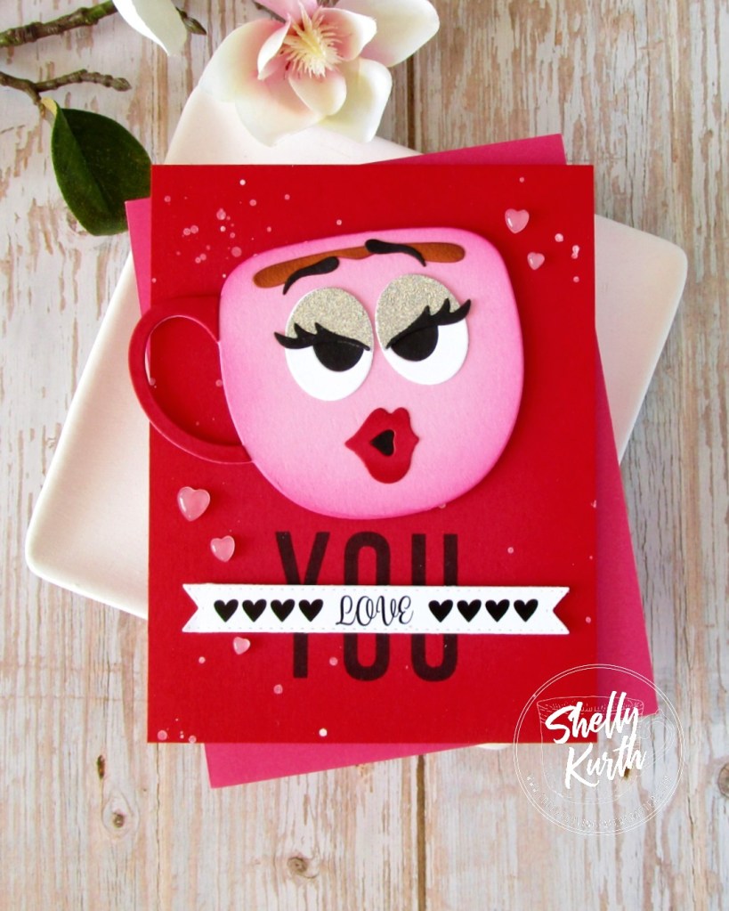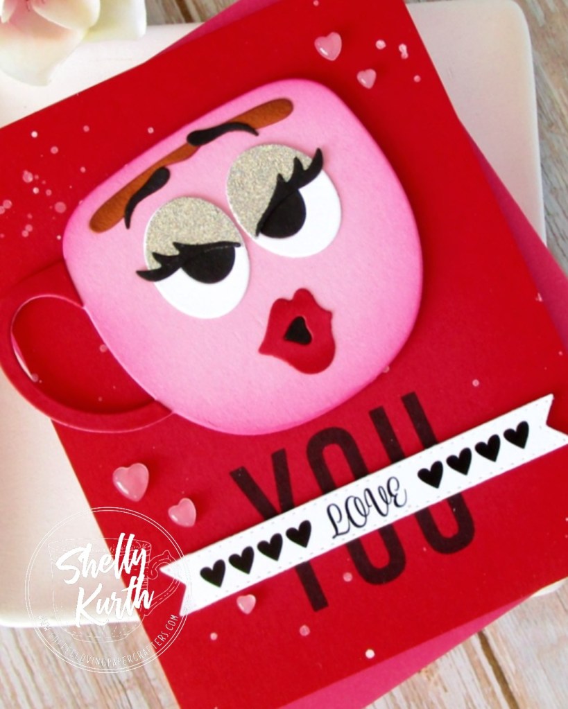 Fun, right?!…Those cups are something else, I couldn’t resist buying them! (lol) So many faces/expressions that come with the set and how can one not smile and/or laugh seeing things?!…Some glitter eyeshadow and red lipstick for this girl. I kept things simple to make ‘her’ stand out, just some blending of ink around the edges of the red cardstock and some paint splatters. Then a stamped Y O U and a sentiment banner over the top. Lastly, some heart embellishments. Sweet, right?!…
