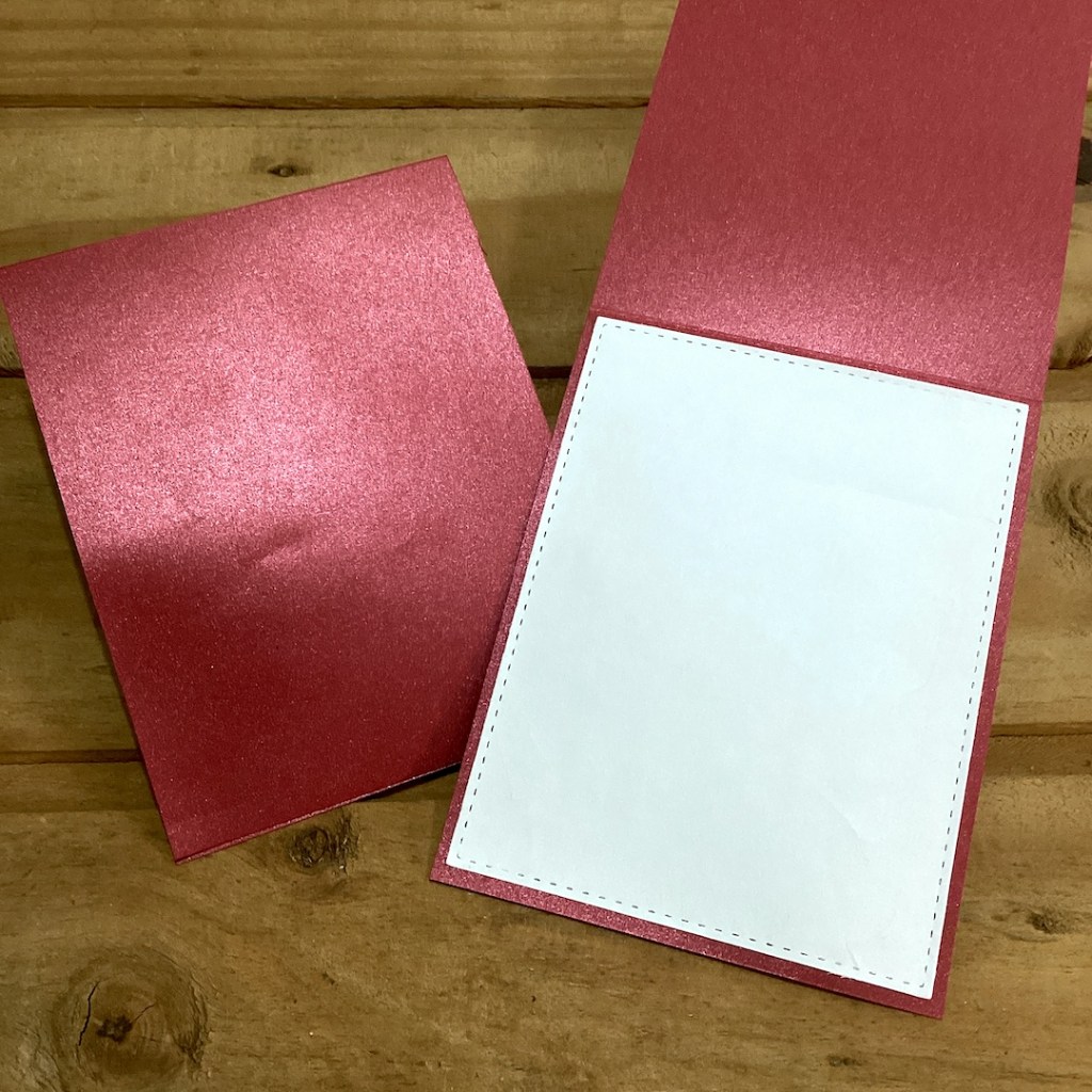 Then I cut two pieces of white cardstock using a 4″ x 5.25″ stitched rectangle die, and adhered them to the inside of the cards.