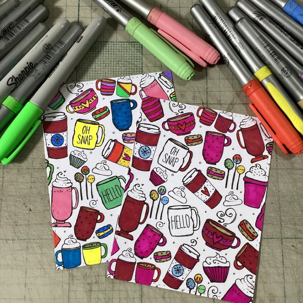 Next, I printed my images on 180gsm/65lb white cardstock, die-cut each image using a 4″ x 5.25″ stitched rectangle die, and used my BIC Intensity Markers to color them – one in only red and pink, and the other I made very colorful.