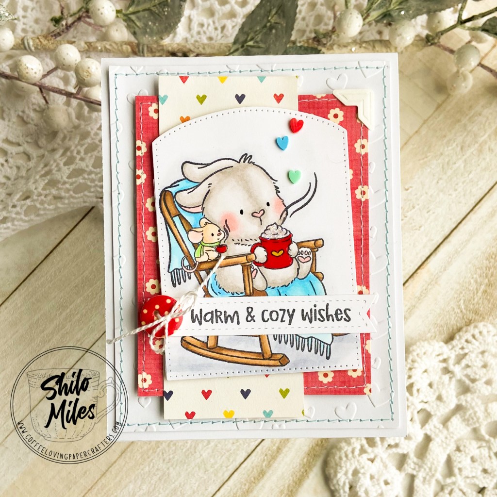 I am sharing a card I made using the Purple Onion Designs stamp set – Cozy Cocoa. I fell in love with Purple Onion stamps because of their adorable critters….and this set is no exception.