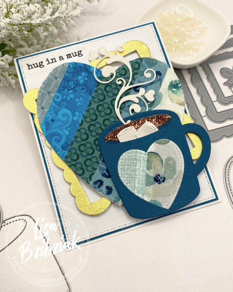 I sewed a block of strips together and then added Easy Cut Adhesive to it from Therm O Web, stuck it on cardstock and then die cut two hearts… the big one for the background and the smaller one for the cup! It was such a fun way to use up scraps. The hearts are from A Jillian Vance Design.