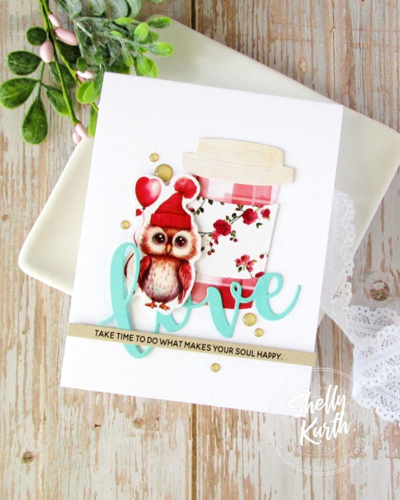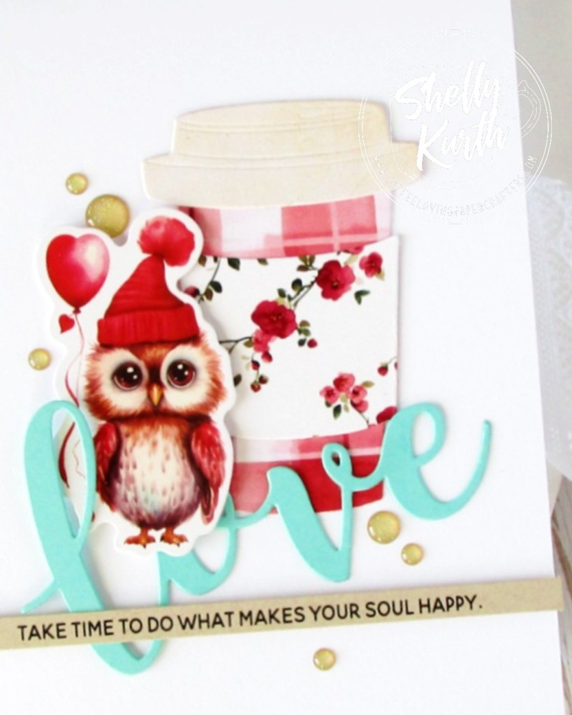 How cute is that owl with a big ol’ cup of coffee?!…I actually did no stamping on this card, just some ephemera and die cutting. That makes things easy, right?!…once done with all the die cutting, I just layered things together on a white card base. Then added some sparkling enamel dots to finish things off. Easy peasy, right?!…