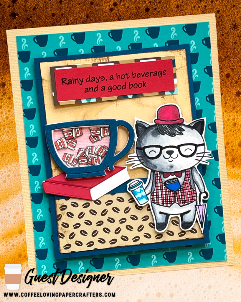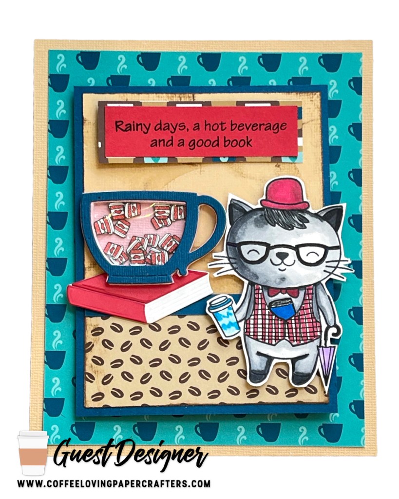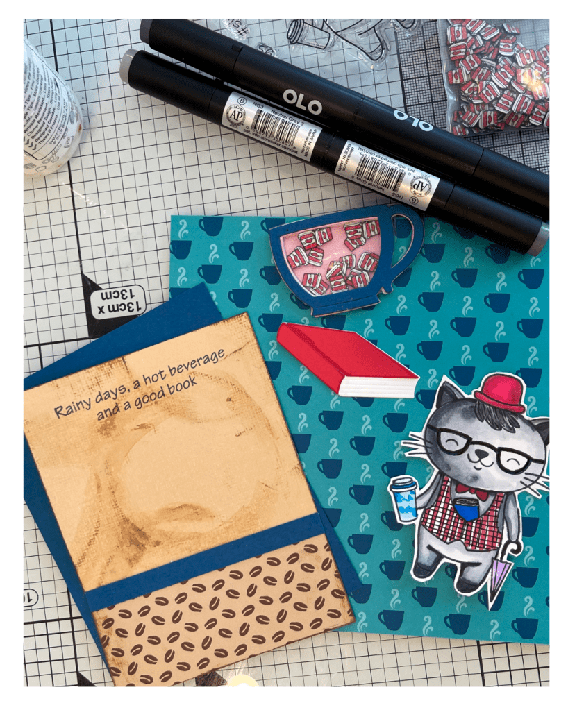 Today, I am sharing my card featuring stamps from The Rabbit Hole Designs. This proper cat gentleman really spoke to me, especially because I always enjoy a coffee and a good book. The cat was colored using Olo Markers.