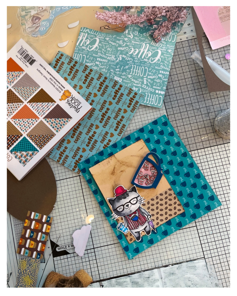 Choosing patterned paper is always a fun experience. I like to experiment with different options until I find one that feels just right, which usually means my desk is covered in piles of paper. In the end, I chose a design from Newton’s Nook Coffee Shop pad.