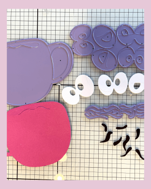 I started by die-cutting out the Pixi Dust Designs mug and the eyes, eyelids, and lashes. I decided pink was my color of choice for this project. I like the biggest set of eyes and found the coordinating pieces to make flirty eyes.