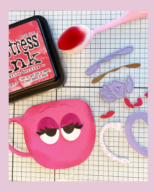 Next, I used Distress Ink in Festive Berries to darken the eyelids and create a darker edge around the mug. I die-cut the coffee, lips, and the mug handle, but then decided I wanted the handle to be the same color as the mug.