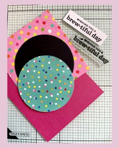 I used leftover scrap papers from Photo Play’s “Snowball Fight” and Simple Stories’ “Sunkissed,” along with black, white, and pink cardstock. The sentiment stamp from My Favorite Things’ “Coffee and Conversation” stamp set felt like a perfect match for this fun mug face.