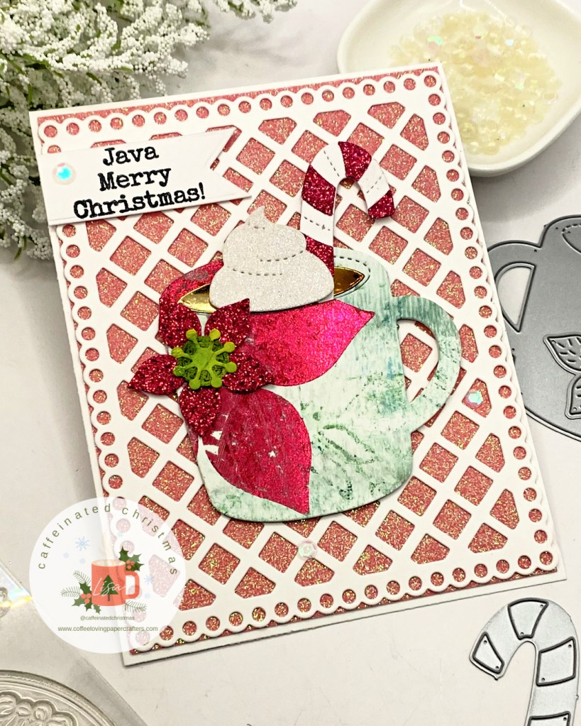 I used the Winter Mug Dies from Pretty Pink Posh for the mug. I die cut the mug from a gel print I had added a poinsettia to using Easy Cut Adhesive and Deco Foil. Then I cut the coffee piece from foiled toner paper. I added another layer to the poinsettia with that bright pink glitter paper from Your Paper Insider, as well as for the candy cane.