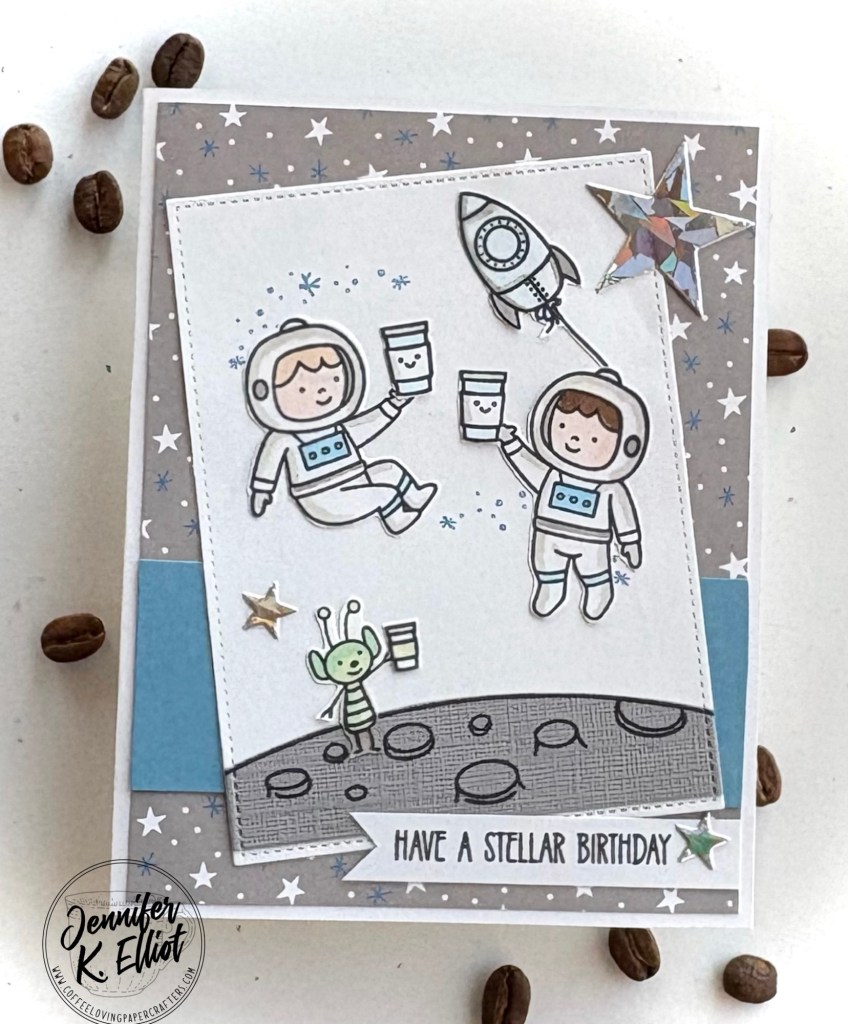 Celebrating the historic space flight today’s card features the retired Avery Elle Astronauts, Lawn Fawn coffee cups from the Treat Cart Add On Coffee set and die cut stars using Pink & Main holographic paper.