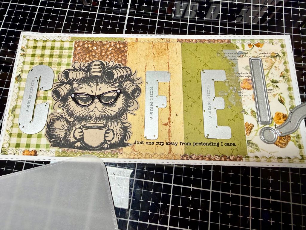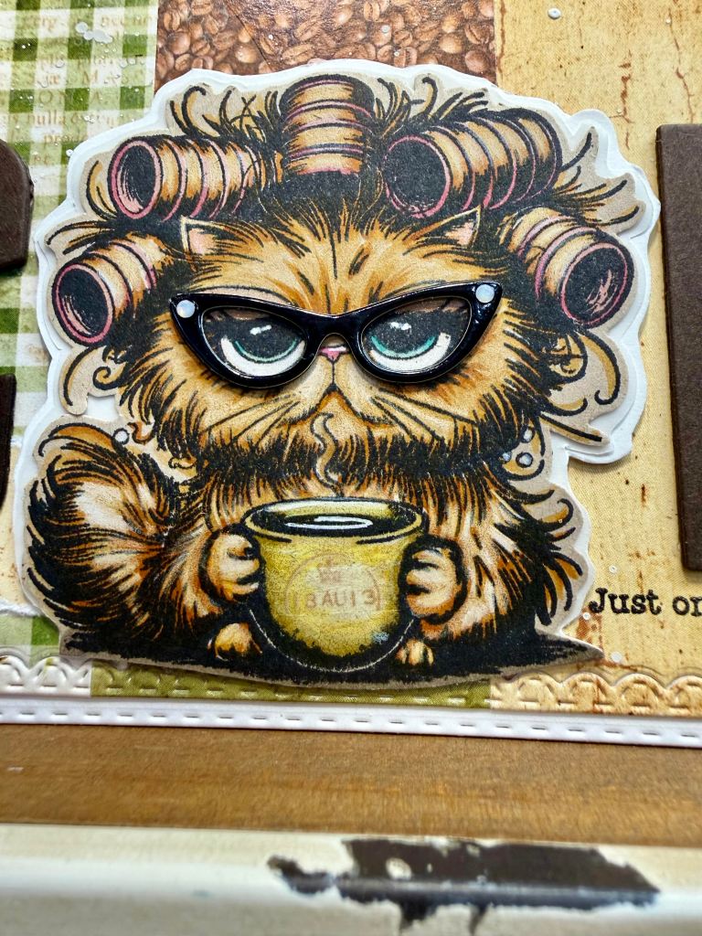 I diecut (3x) the CFFEE!! from Hot Fudge card stock by Cardstock Warehouse. Glued the layers together. (She is the O;)