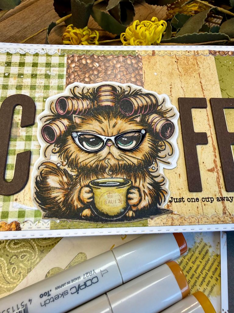Here is my 4th post for the Coffee Loving Papercrafters blog, as April Guest Designer. I have certainly felt privileged and enjoyed participating! Thank you to all for making me feel welcome. I am truly honored. Today my card features yet another Pissy Kitty from Unity Stamp Co. and I believe the sentiment says it all…