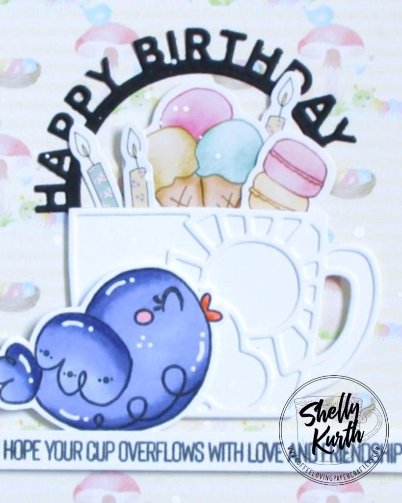 Fun, right?!…I started with the stamping, coloring, and fussy cutting the bird. Then some thinking took place because I honestly didn’t know what I was doing. (lol) But I started to go through my little stashes of die cut bits and whatnot and saw the coffee cup and thought that would be cute. Then I started working with those couple things and just started going through more stashes and eventually things just came together. Overall, I think everything works and things came out quite cute, yes?!…