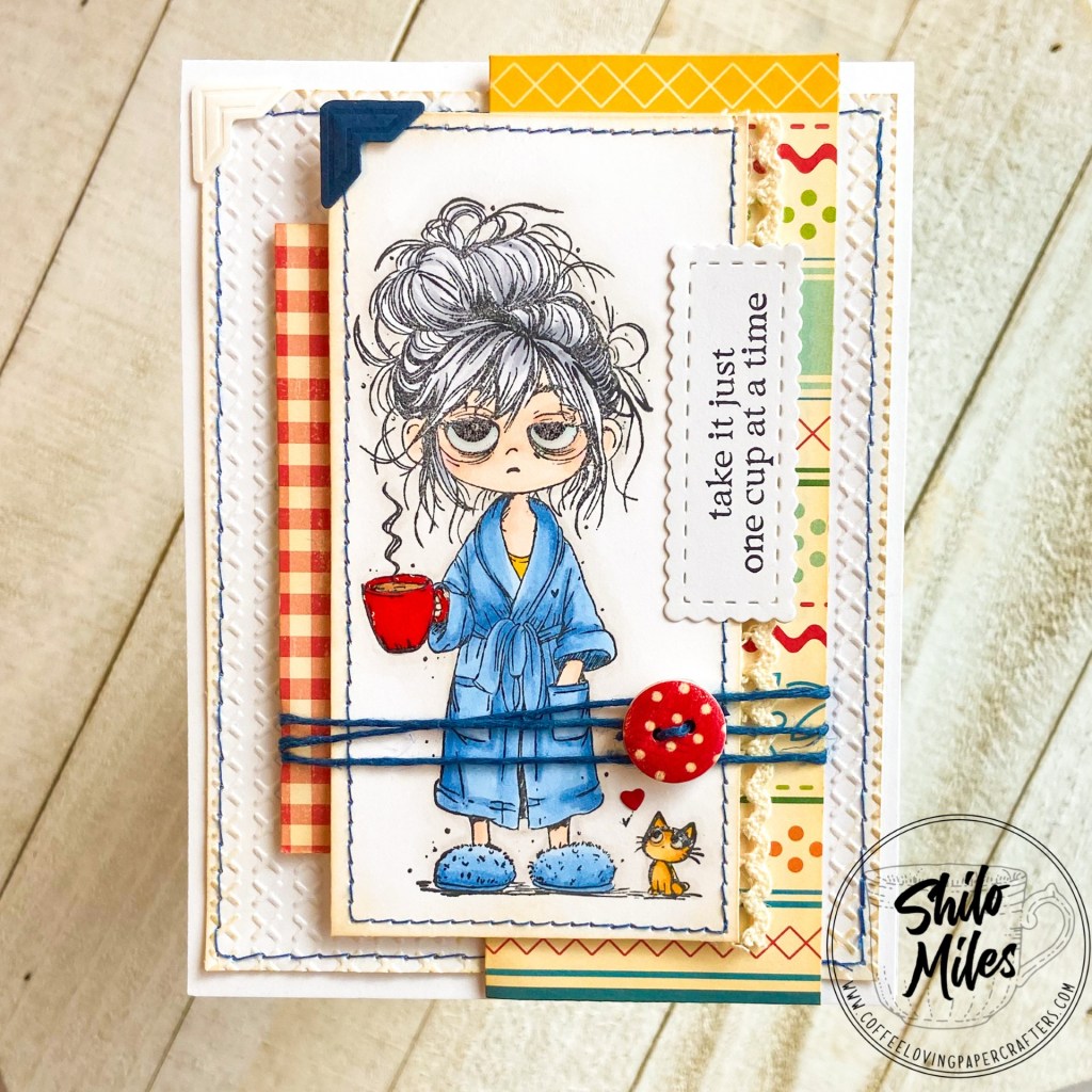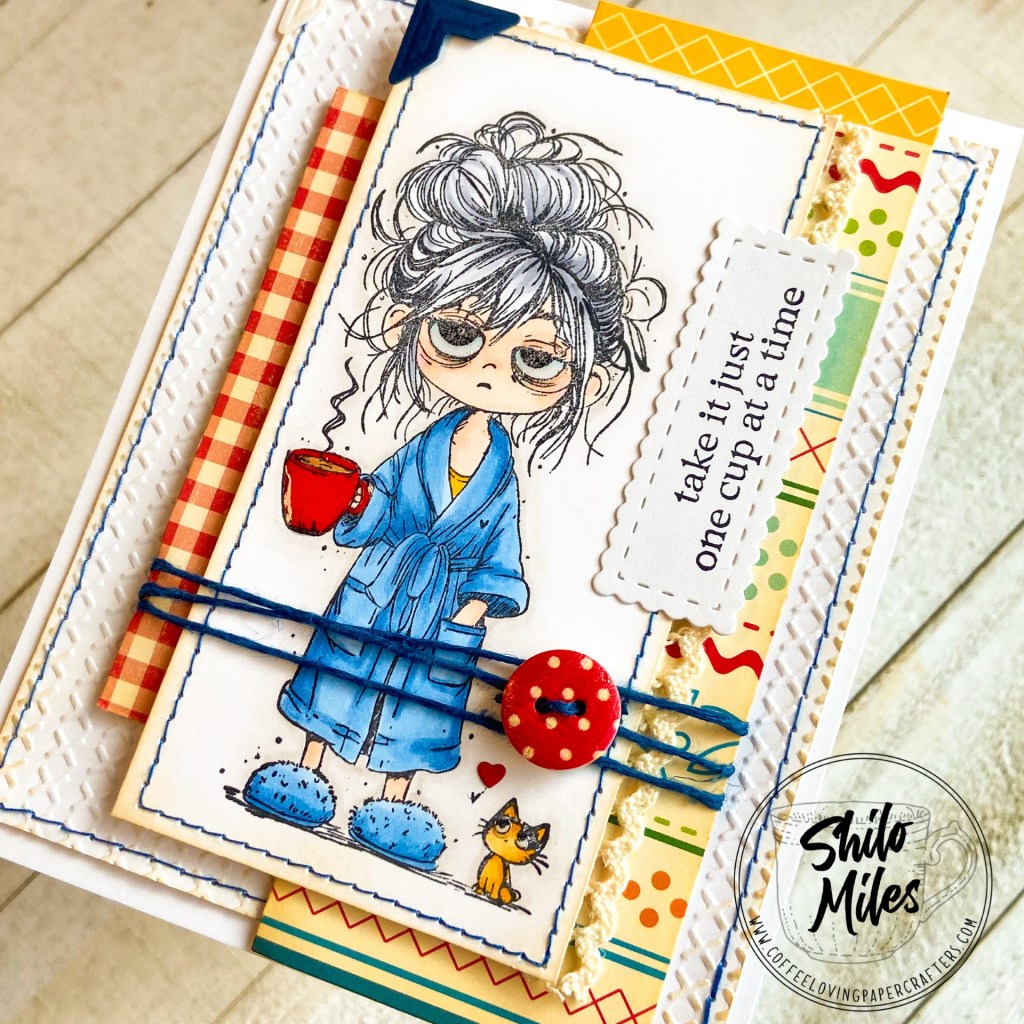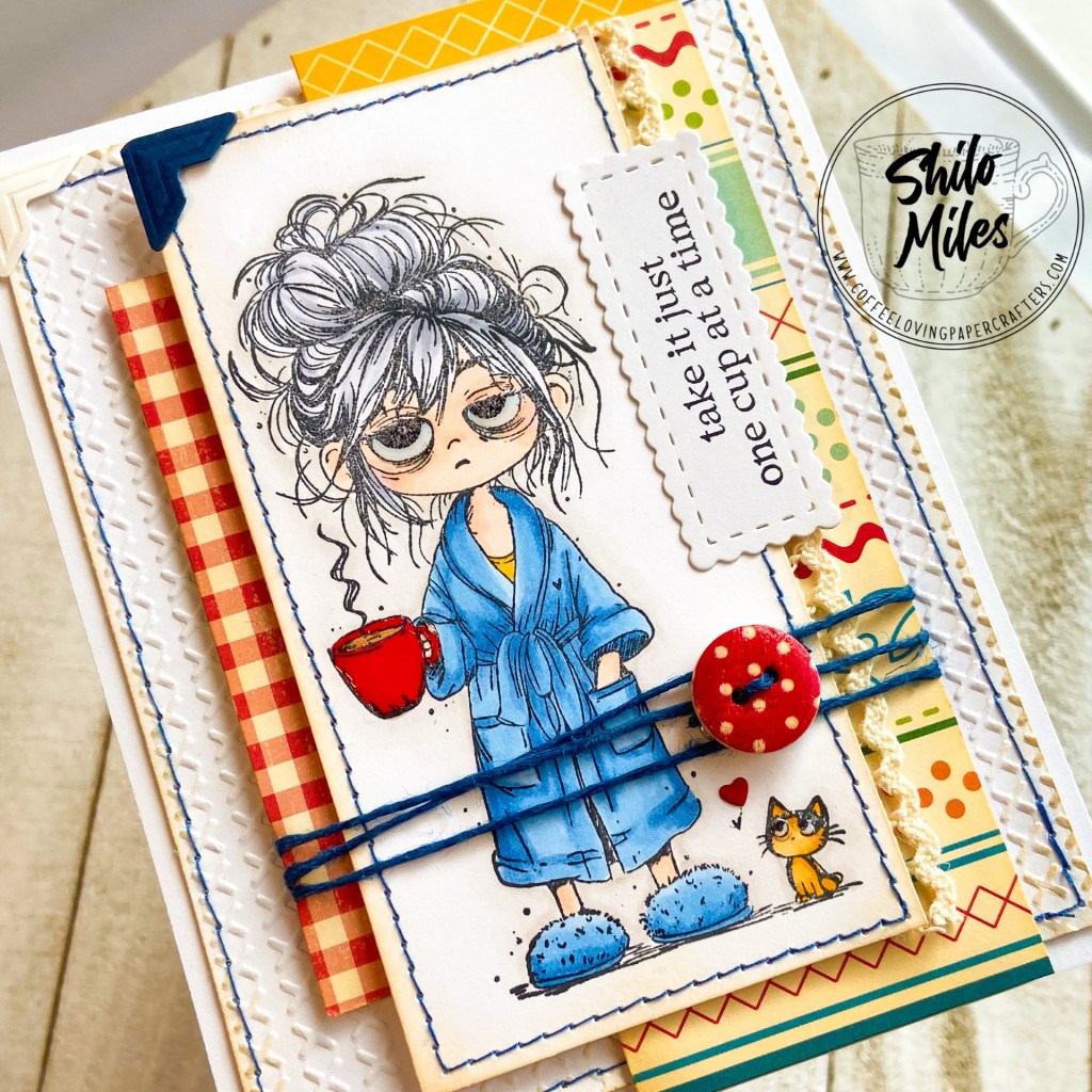 If this girl had sweatpants on under that robe – this would be me! Haha I think I got the hair happening though…pretty much every morning. And the eye bags. I love stamps like this – it captures some of real life so it is relatable to ALL of us. Also you could color the hair and robe to resemble anyone you know and they likely would see themselves in it.